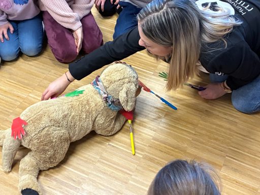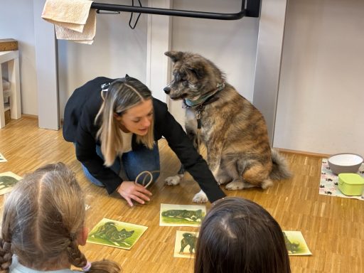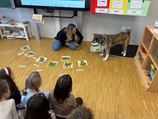 Seit diesem Schuljahr unterstützt uns Lesehund Jua Li an der Grundschule. Jua Li ist eine besonders freundliche und ruhige Akita-Hündin, die Kindern beim Lesenlernen auf einfühlsame Weise hilft. Wenn die Kinder Jua Li vorlesen, entsteht eine entspannte, wertfreie Atmosphäre: Niemand wird verbessert oder bewertet – Jua Li hört einfach geduldig zu. Das gibt vielen Kindern Mut, stärkt ihr Selbstvertrauen und macht das Lesen zu einem positiven Erlebnis.